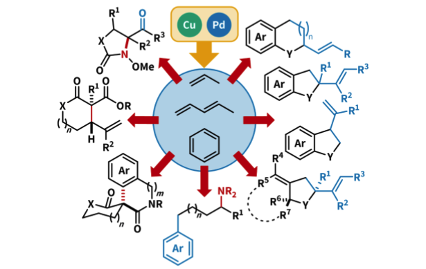 Abstract: The topological complexity of sp3-rich scaffolds imparts specific beneficial properties into organic small molecules and enables refined tuning of a molecule’s properties. However, this complexity amplifies both reactivity and selectivity challenges, making the development of versatile methods to construct and diversify these structures difficult. By combining fundamental advances in transition metal catalysis with organic synthesis, we aim to discover new reactions to solve unmet challenges in the construction of functional sp3-rich organic scaffolds. In one area, we have found that identifying “unconventional” ligand platforms for palladium catalysis leads to new reactivity and selectivity in olefin heteroannulation reactions. In another area, we have found that copper complexes can promote a range of oxidative radical addition reactions.